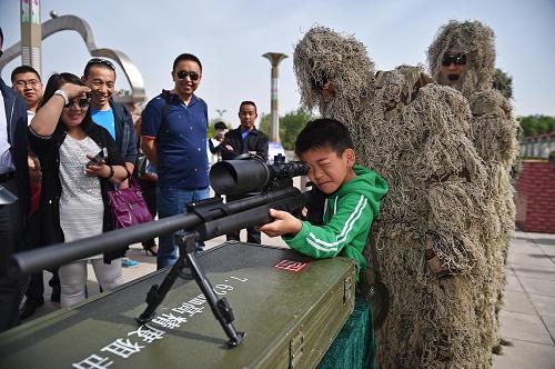 5月9日,一位小朋友在银川市公安局特警支队特警队员的指导下体验狙击步枪。