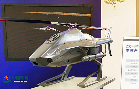 作为小型无人机的领军企业,本届展会紫燕公司带来了多款小巧的单兵无人机。其中,“人小鬼大”的“渗透者”察打一体无人机,酷似一只放大版的“蚂蚱”,最大时速180千米,自重不到25千克,拥有一定的隐身能力,可携带2枚火箭弹进行反恐打击。